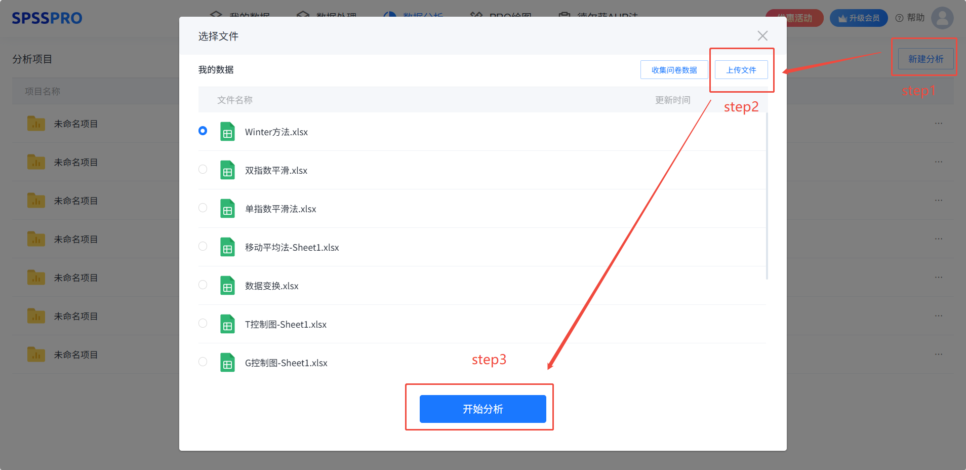 Step3:选择对应数据打开后进行预览,确认无误后点击开始分析;