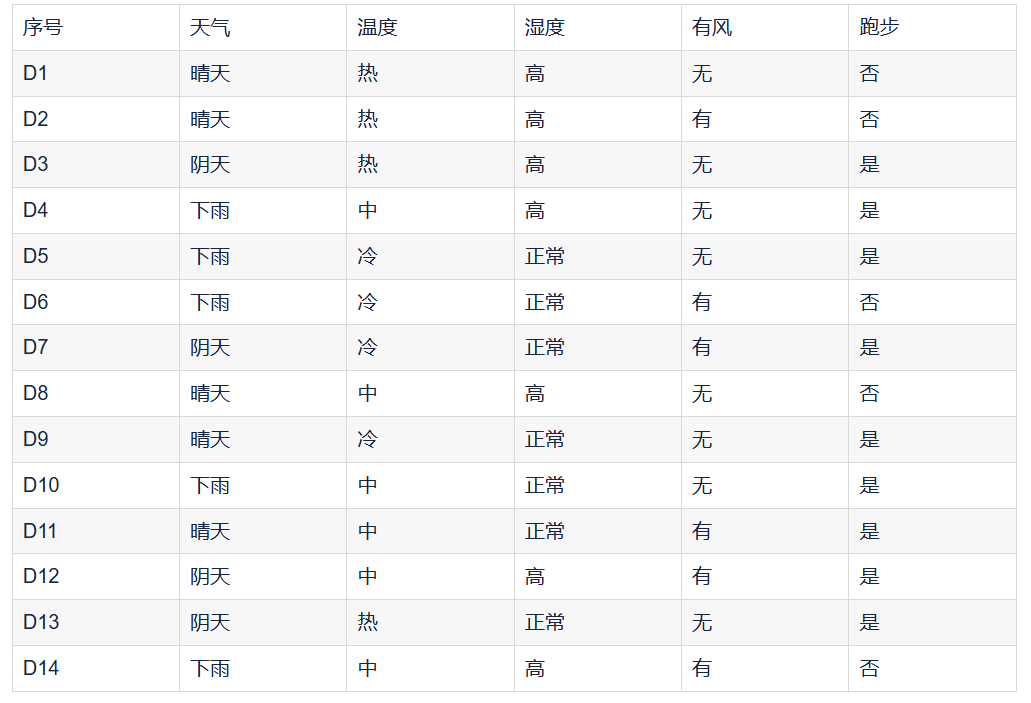 现有一个微型数据集,根据天气状况决定是否进行户外跑步。