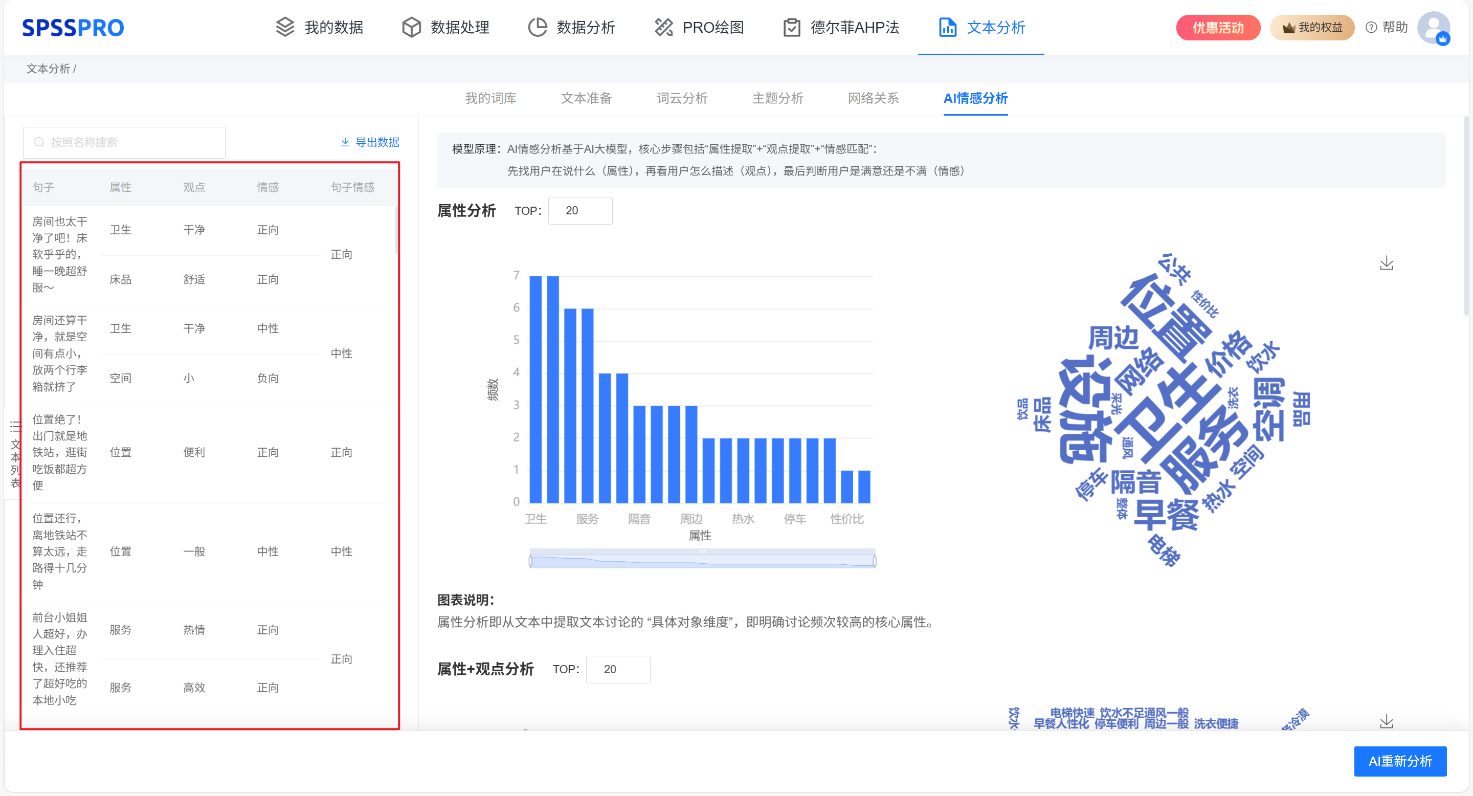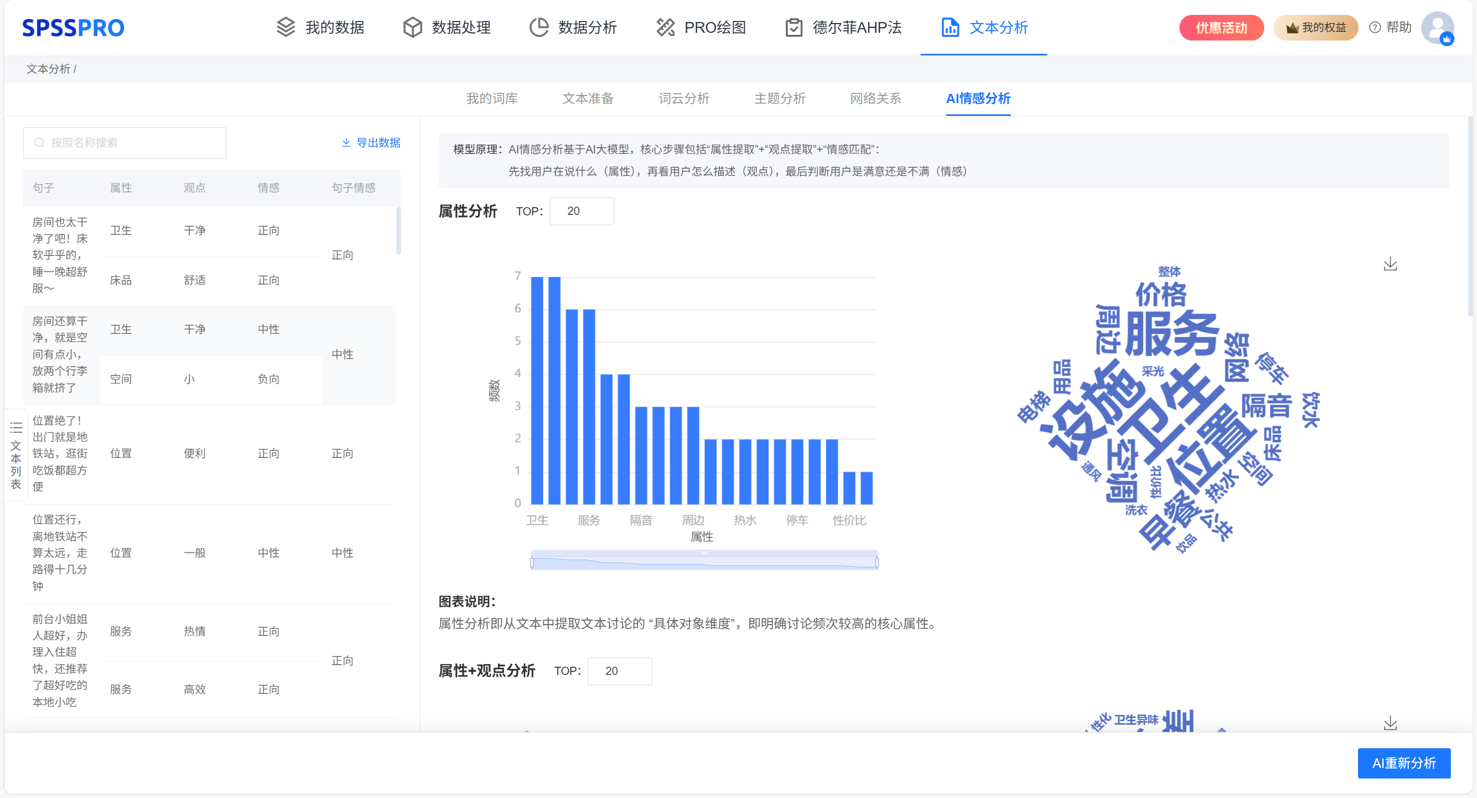 - 属性分析:将所有文本提取出来的属性进行柱状图和词云图可视化,直观体现核心讨论对象,比如说“服务”“卫生”;