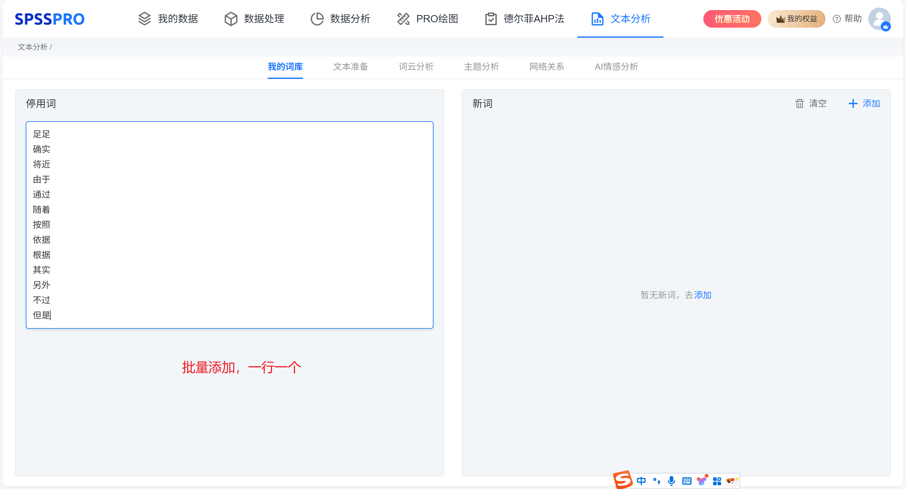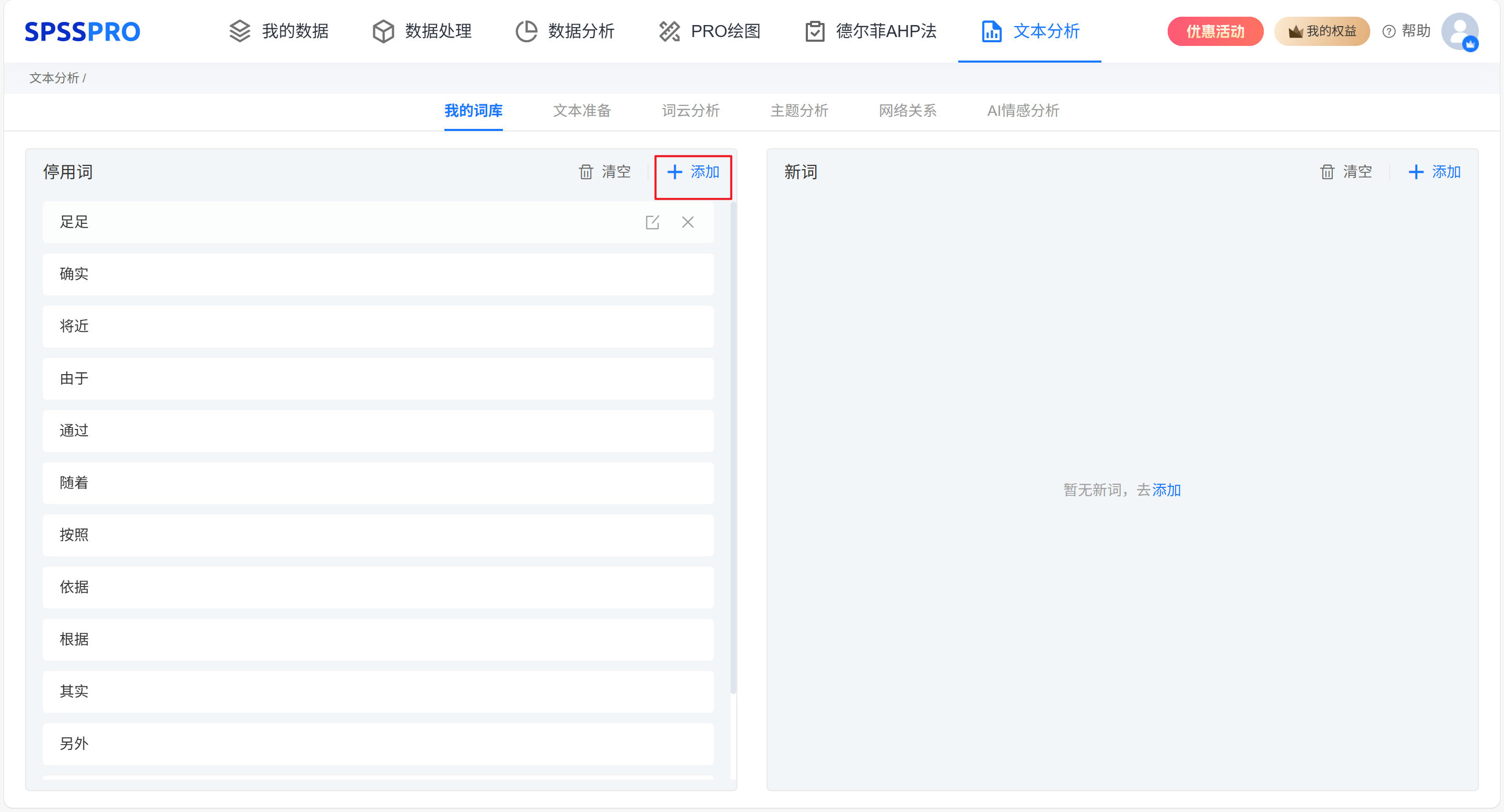 在文本分析中,新词和停用词是提升分析精度的关键步骤,我的词库中可以对新词和停用词进行管理: