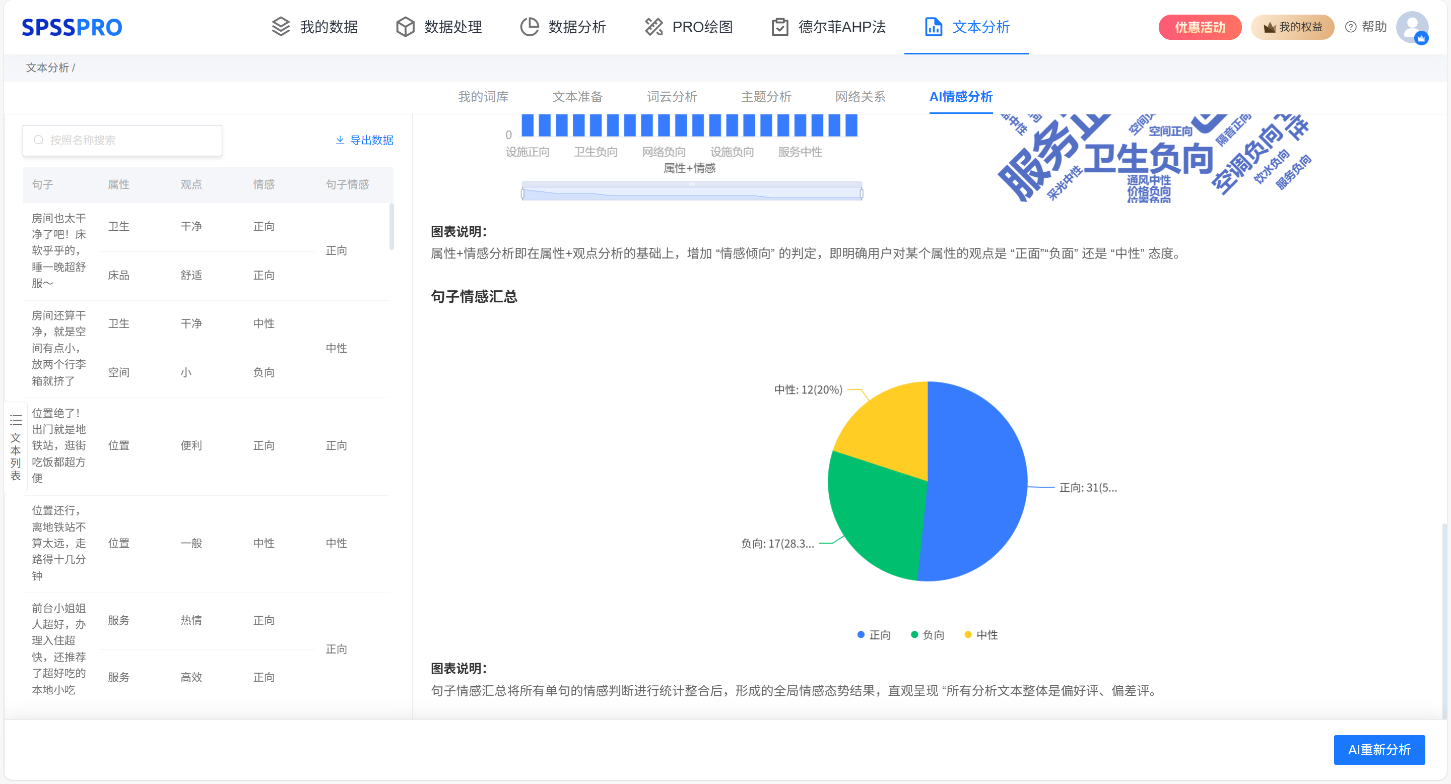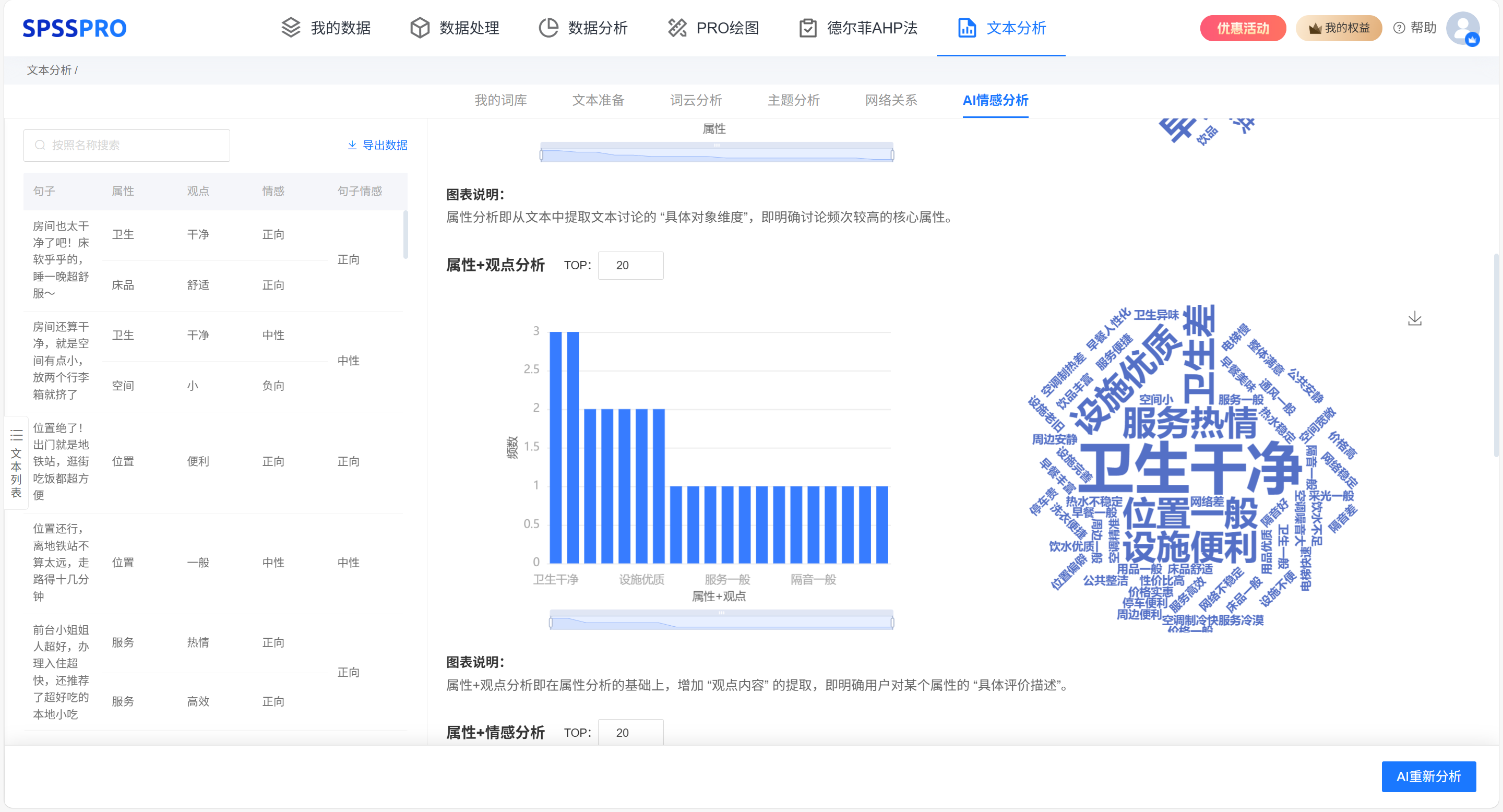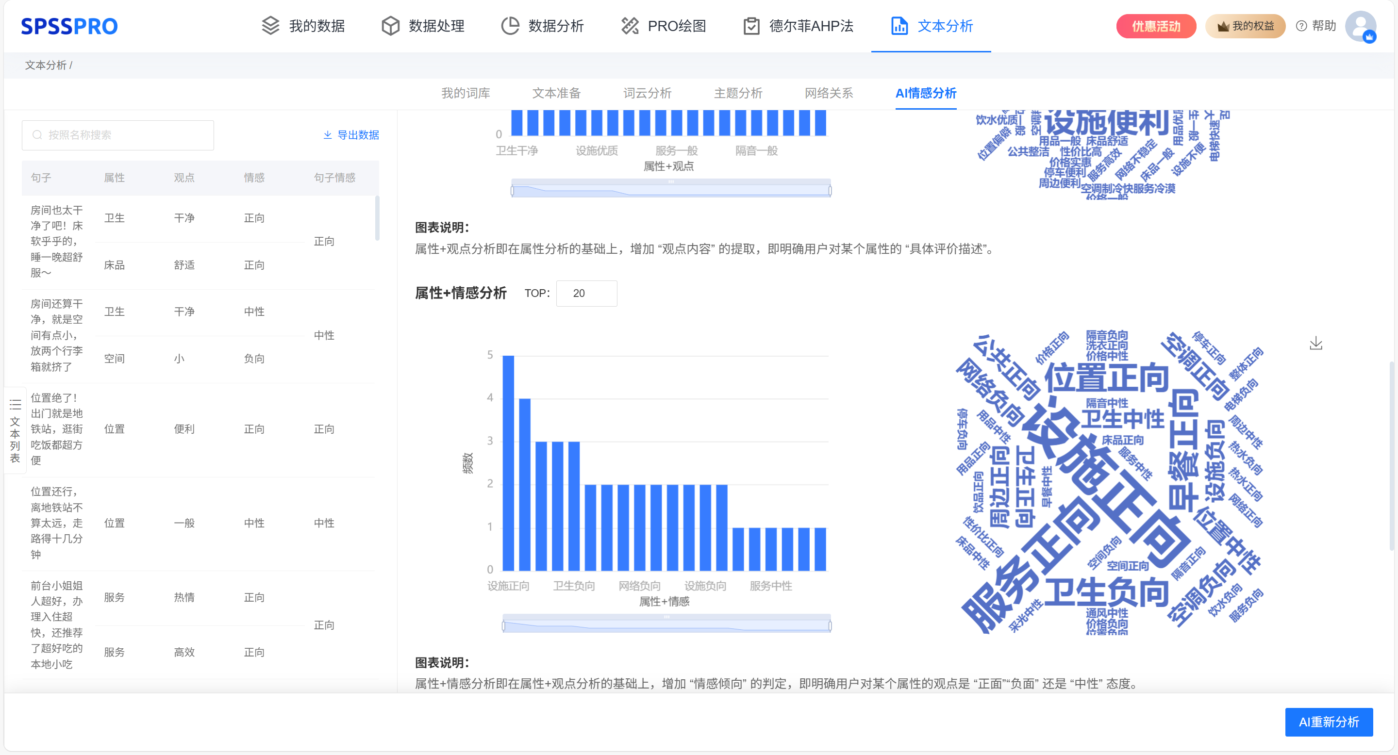 AI情感分析基于AI大模型(将会消耗AI点数),核心步骤包括“属性提取”+“观点提取”+“情感匹配”;