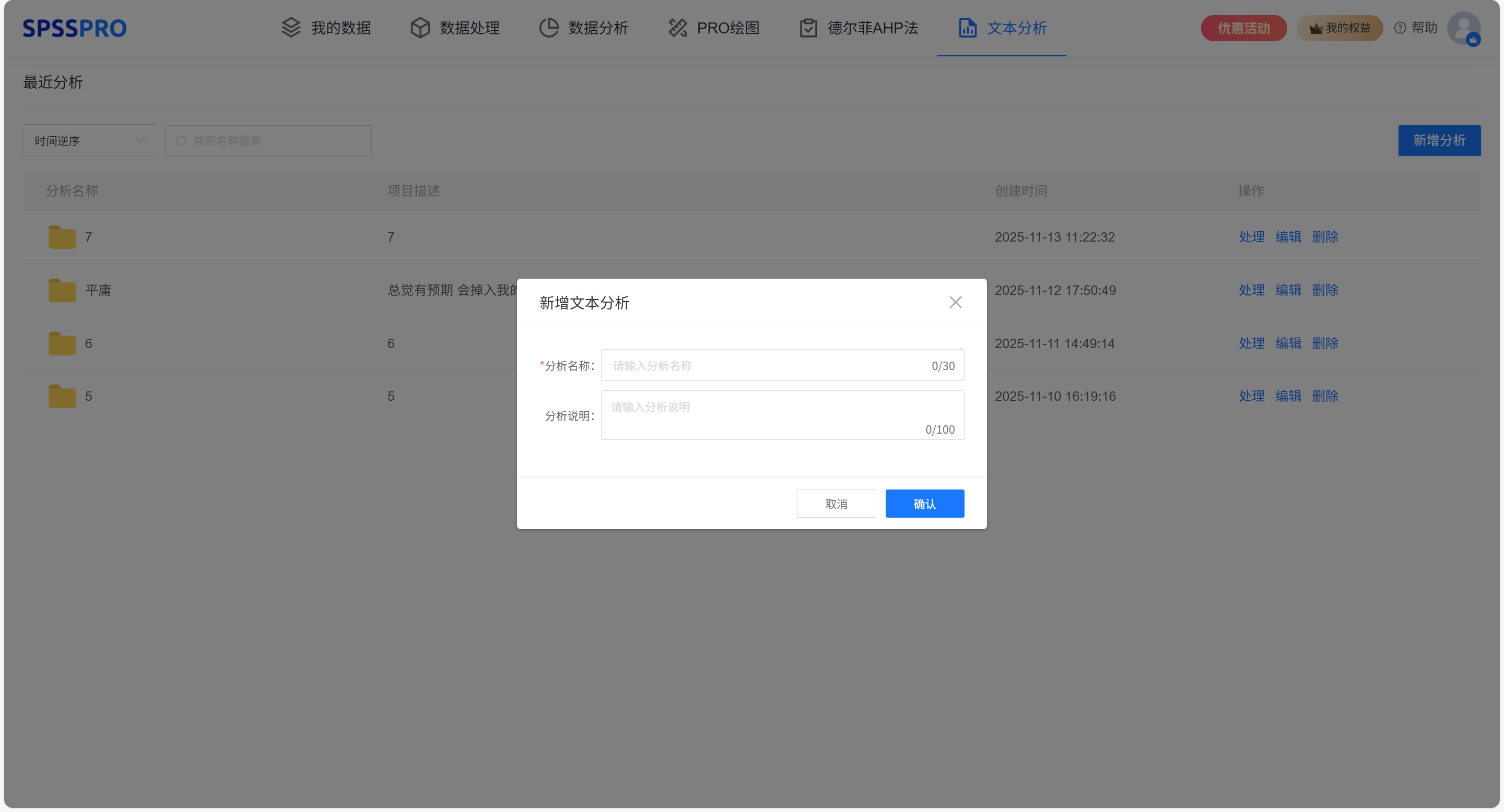 在文本分析模块中,点击【新建分析】,填写文本分析名称和分析说明,即可创建分析记录;
