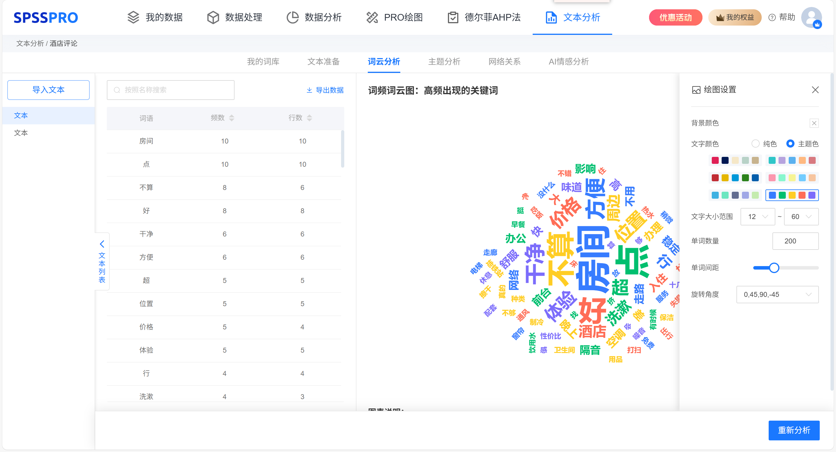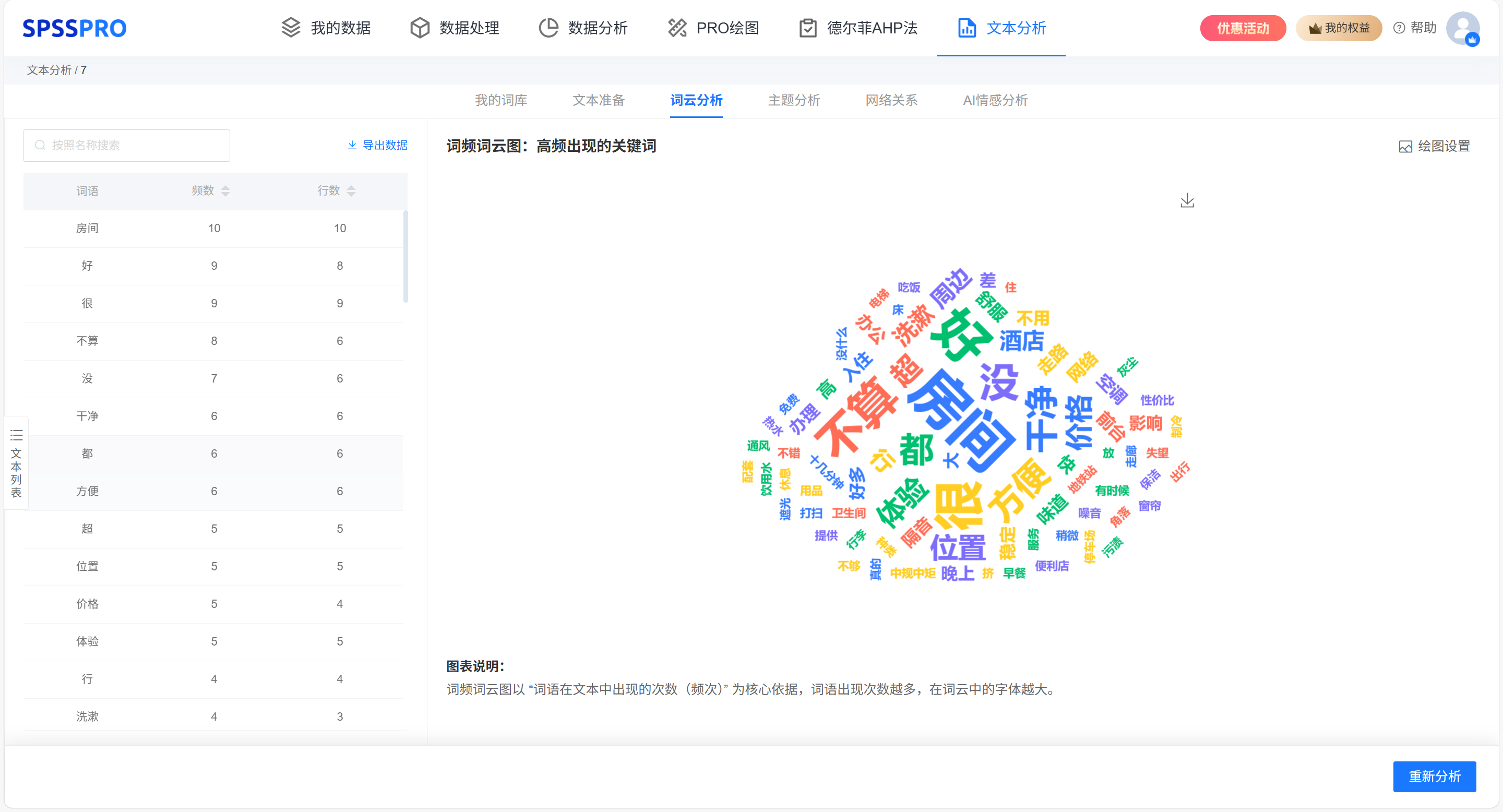选定指定的词进行词云分析,词云图中字体越大的词,出现频次越高或权重越重,能瞬间看出文本的主题焦点(如房间、价格、体验、位置、周边、洗漱是用户比较关注的点,直接点明核心主题)