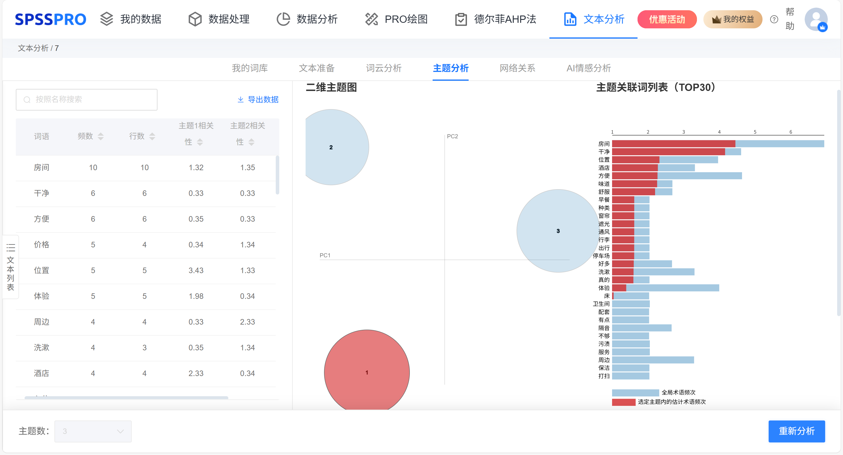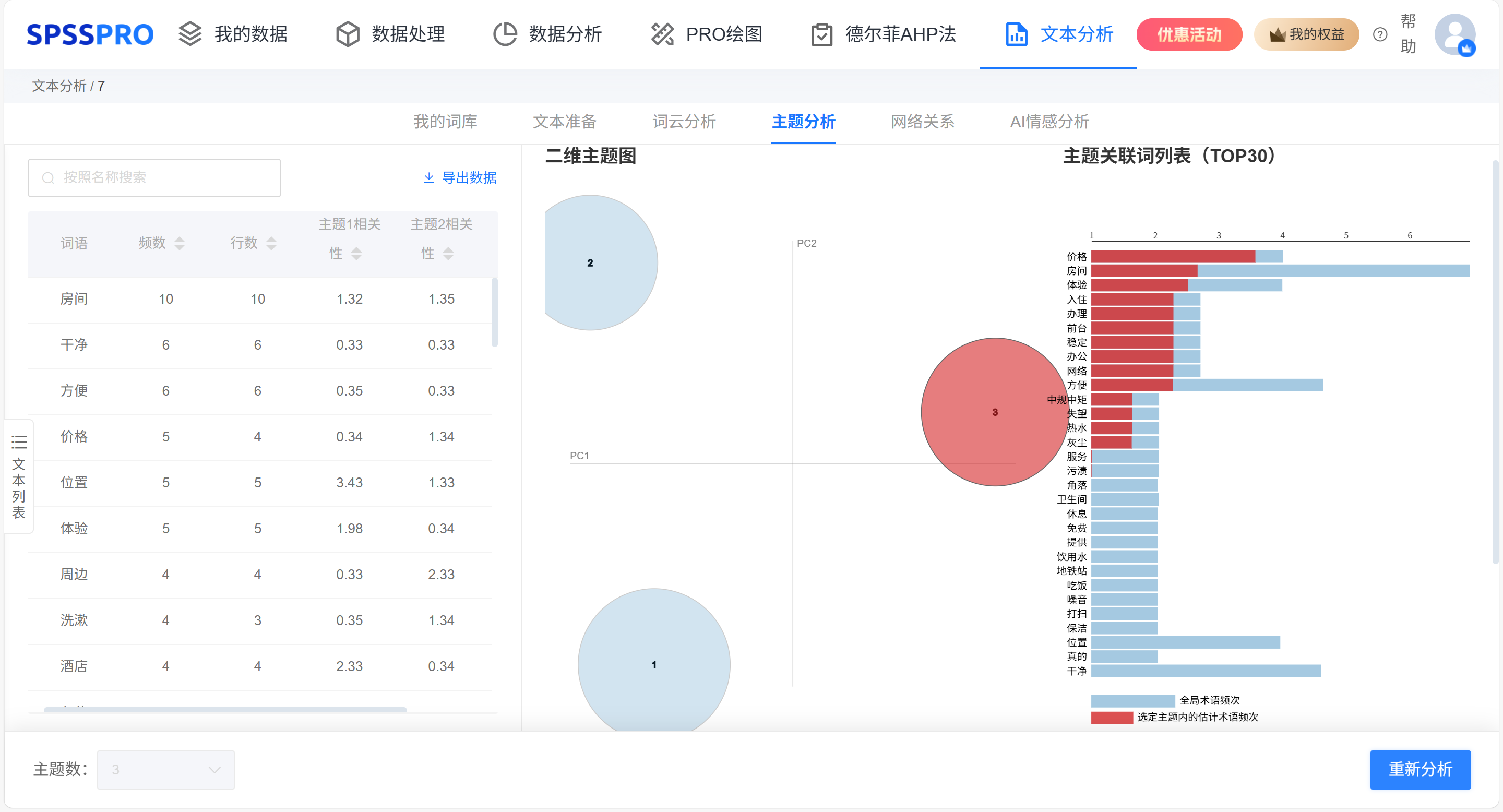 指定主题个数,系统会对自动词语进行分类,在图表中指定图表,红色柱状图展示该主题内的估计术语频次,即代表该主题中比较重要的词语;