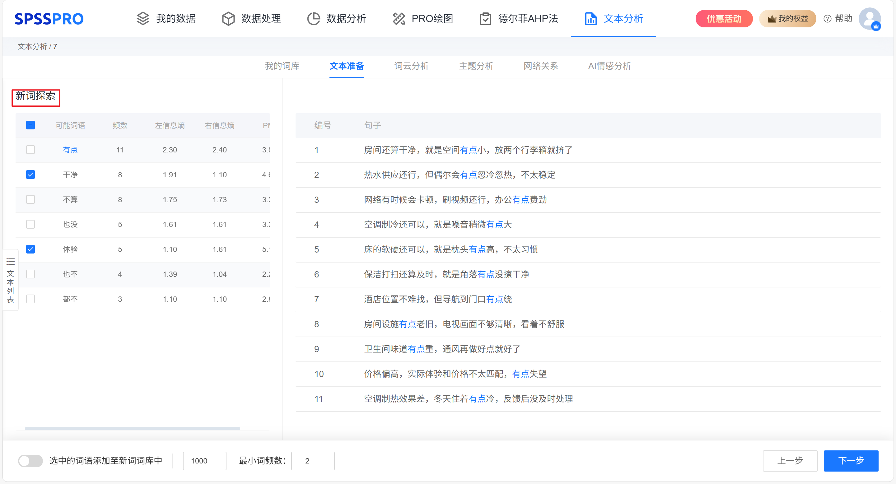 - 新词探索:挖掘数据中未被常规词典收录的高频词(如机器学习,若是正常分词会被分成机器和学习,通过新词探索可提取机器学习),避免关键信息遗漏。但是若系统没有识别到新词,将会跳过此步骤;