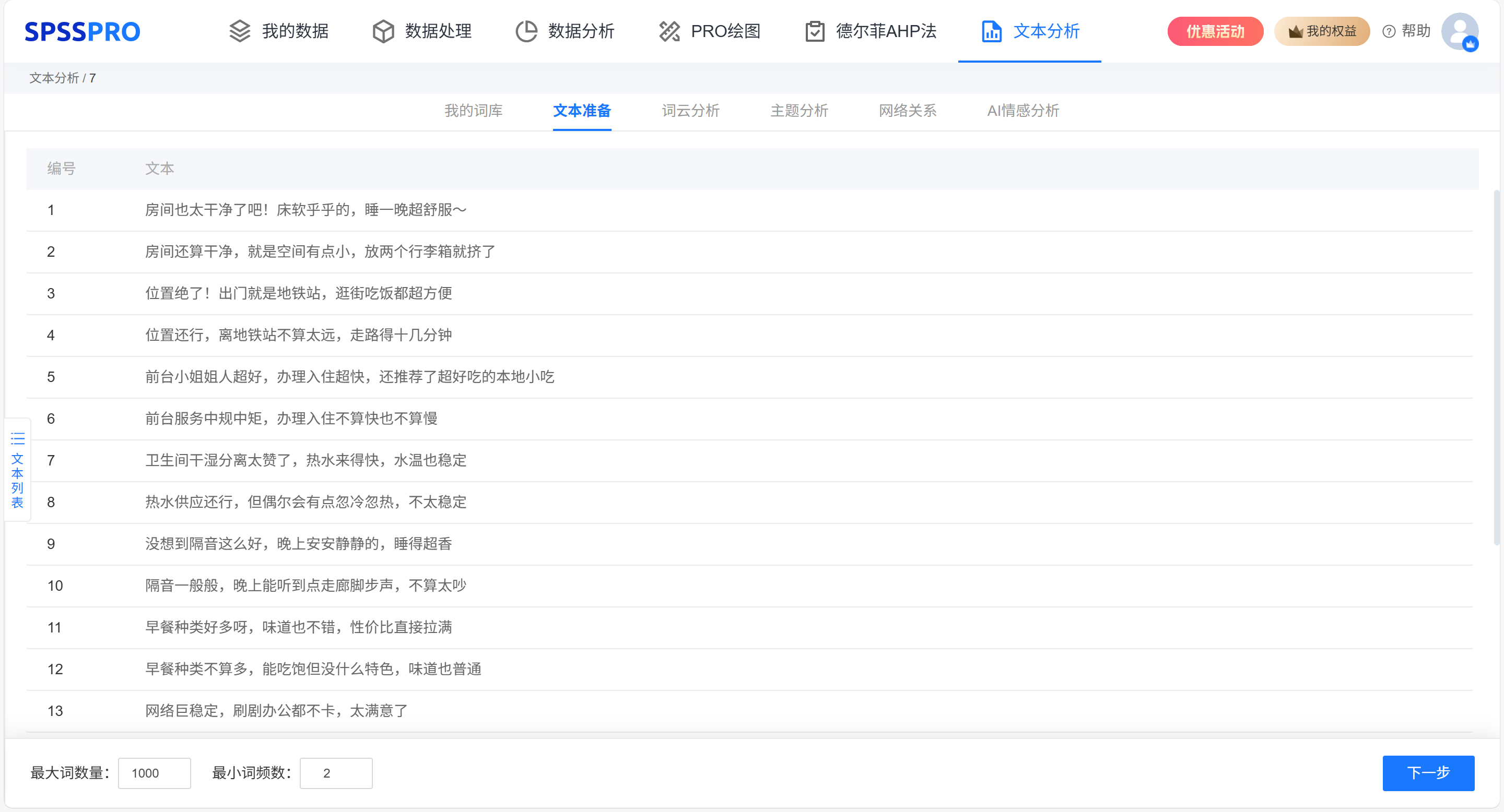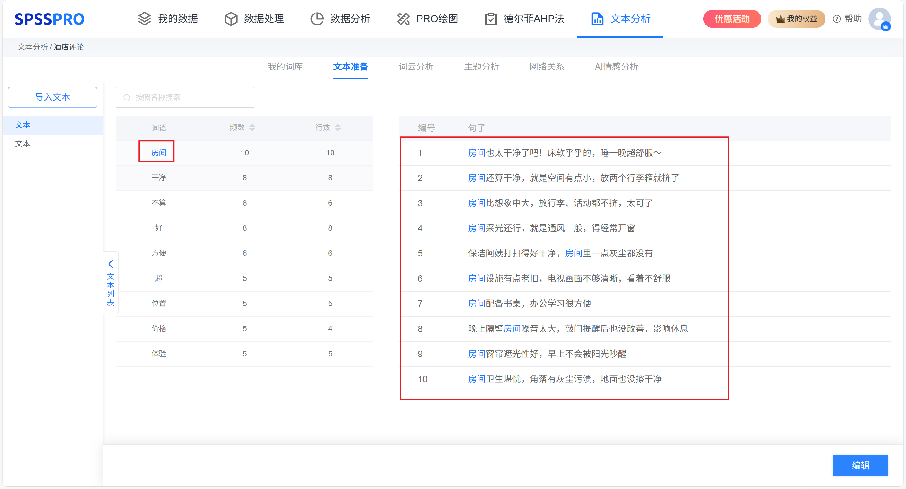 文本分析功能覆盖了从数据预处理到深度洞察的全流程,其中包括了文本准备、词云分析、主题分析、网络关系分析、情感分析几部分功能;