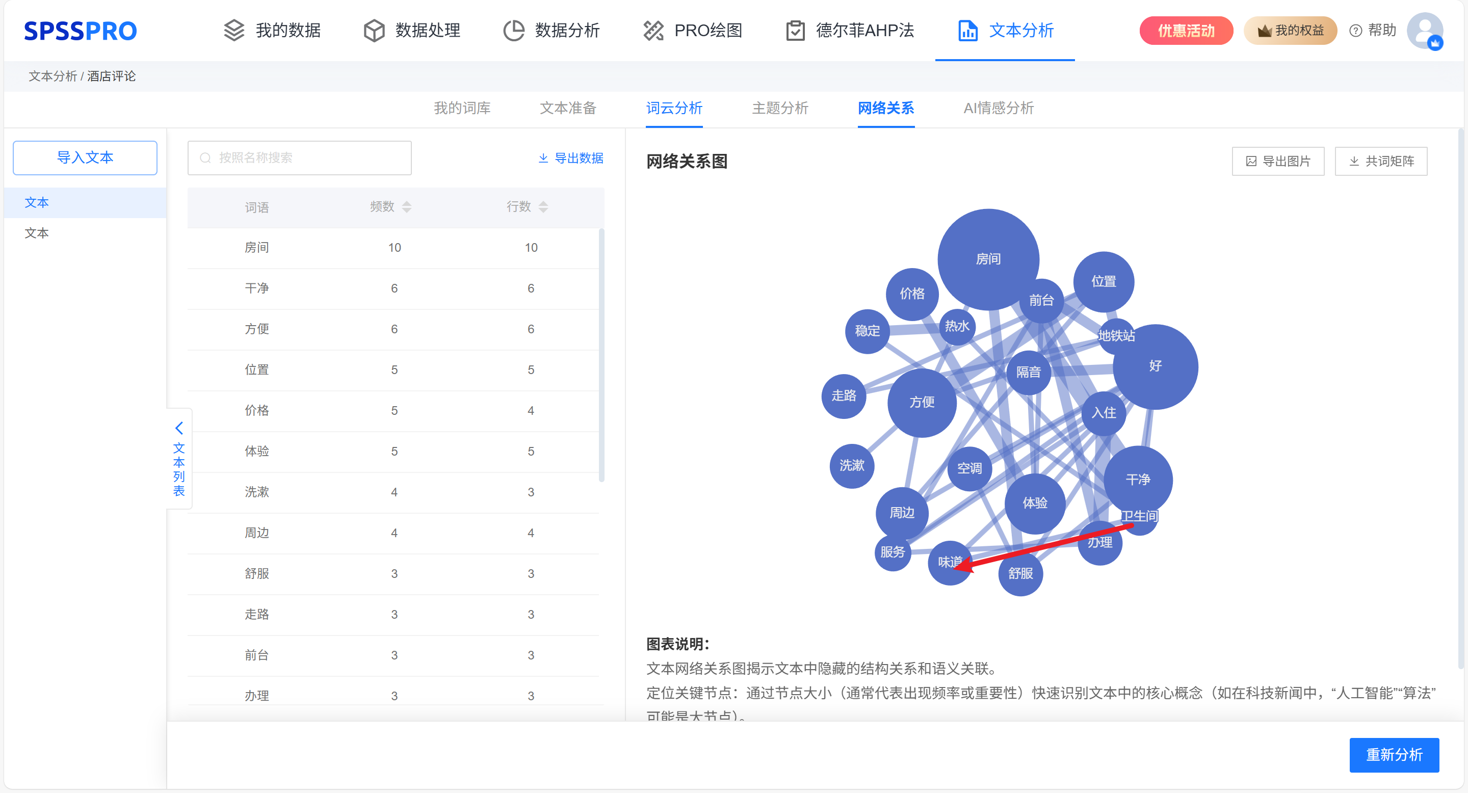 网络关系图用与分析词语之间的关联强度:主要关注节点之间的连线粗细,连线越粗说明两个词在同一句子中出现的次数越多;
